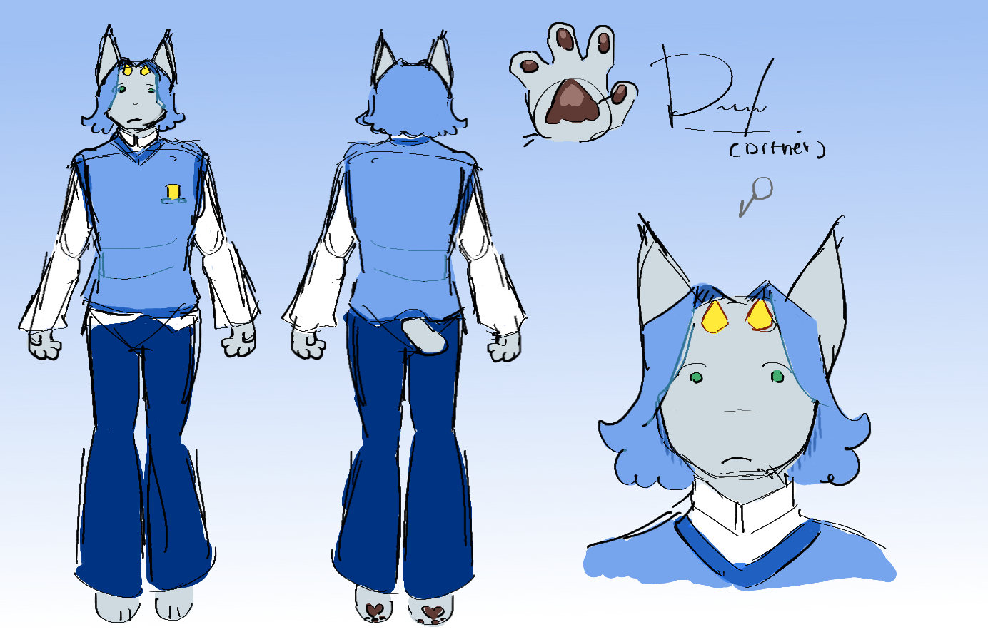 He is a hardworking man, loyal to his career. He is a very sociable fellow due to his upbringing in a tight-knit community. He likes staying in his comfort zone, rarely venturing and trying something new. Whenever he does, he frequently expects the worse, riddling himself with anxiety. His species is usually carnivorous (as all cats are) but he repulses this lifestyle and is vegetarian, out of fear of cannibalism. He views himself as a common man trying to get through life on their own pace.